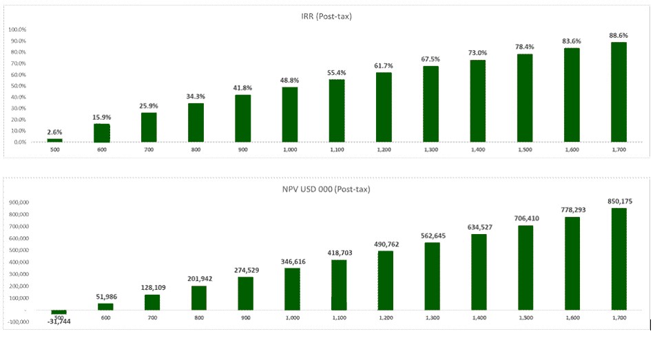 The Project demonstrates strong leverage to tungsten price. The following sensitivity analysis illustrates the post-tax IRR and NPV (8%) across a flat tungsten price range of USD $500 to USD $1,700 per mtu WO₃.