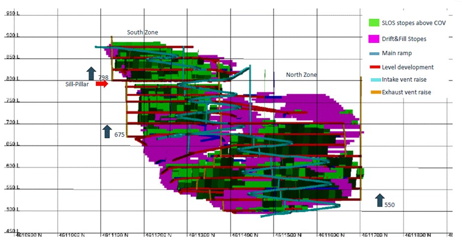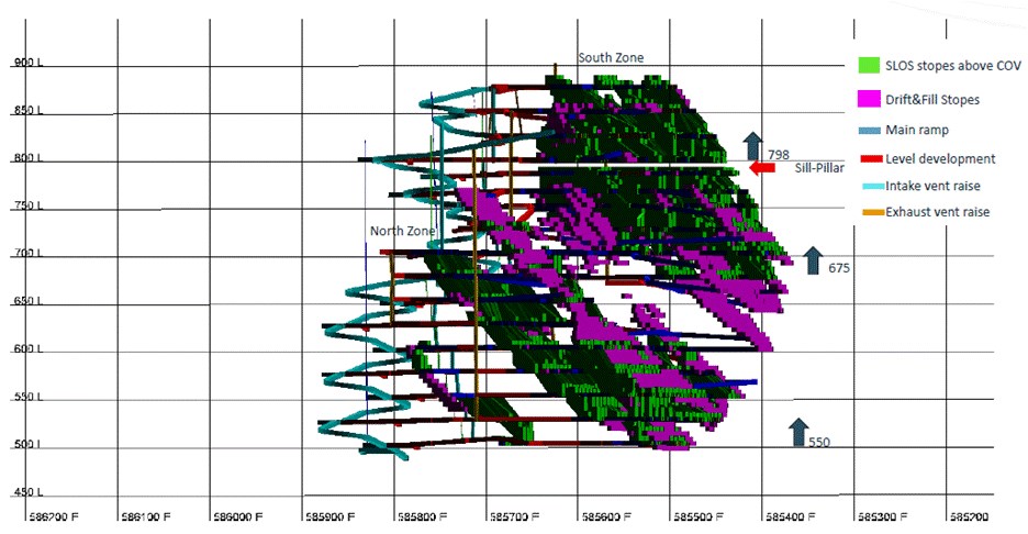Drift-and-fill mining is incorporated locally in narrower high-grade zones to enhance resource recovery. Open-pit mining and alternative underground methods were evaluated during the conceptual study stage and were not selected due to environmental constraints, scale suitability, and relative operating efficiency.