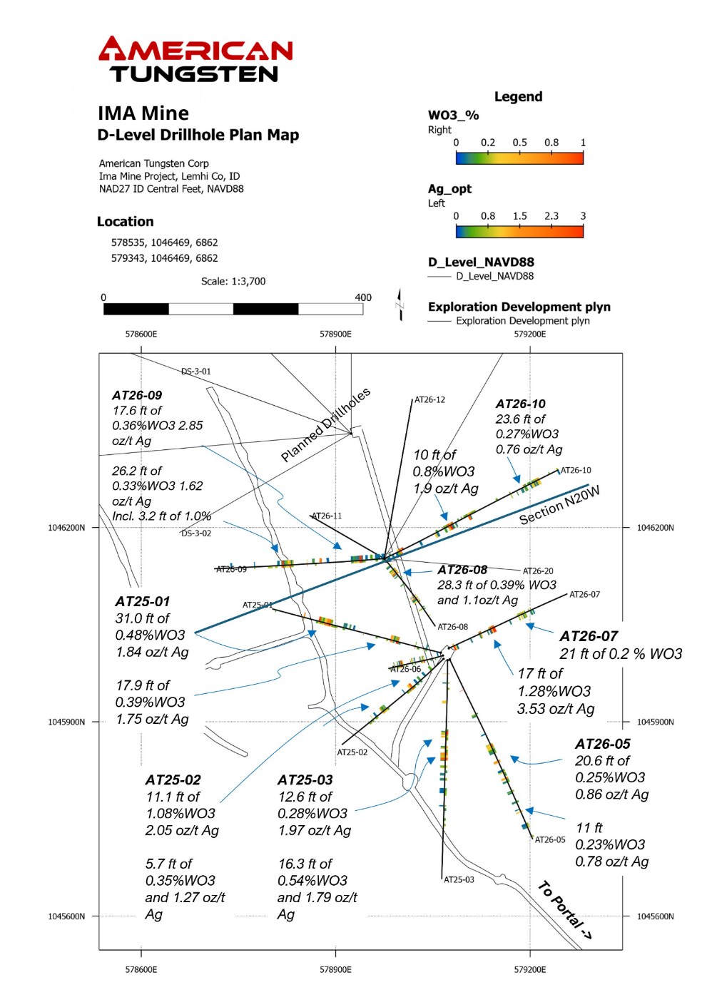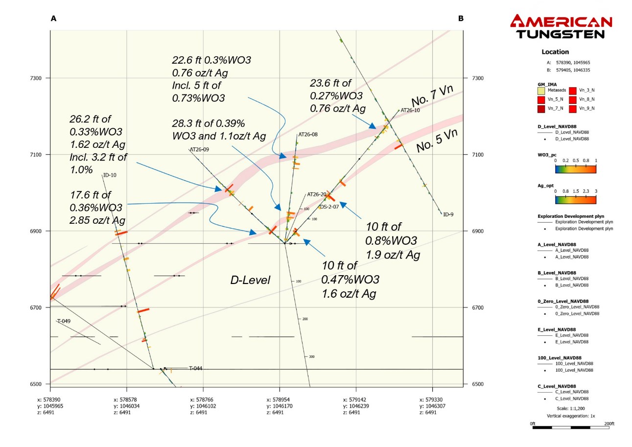 March 25, 2026 (Source) — American Tungsten Corp. (CSE: TUNG) (OTCQB: TUNGF) (FSE: RK90) (“American Tungsten” or the “Company”) announces initial drilling results from the second drill station on the D-Level of the IMA Mine, Lemhi County, Idaho. Significant tungsten-silver intercepts in all drillholes demonstrate continuity of the polymetallic vein system along strike to the northwest and up-dip from areas of historical mining.