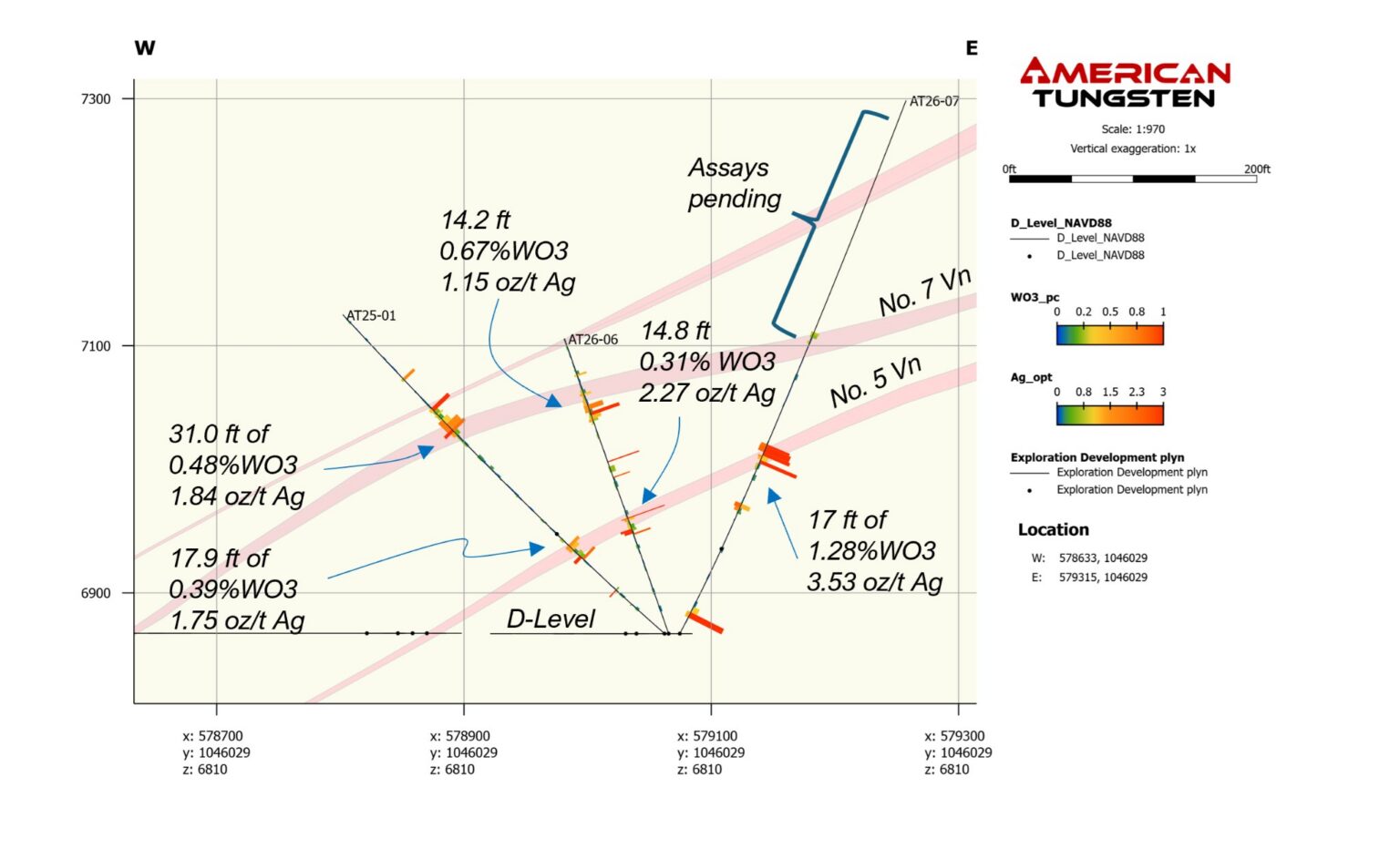 Drillholes AT26-06 and AT26-07 were drilled to expand limits of mineralization up-dip from drillhole AT25-01, as reported February 10, 2026. Both drillholes intersected the No. 5 and No. 7 veins, which have now been delineated over 300 feet up-dip from the D-level. Drillhole AT26-07 intersected the No 7 vein from 273-298 ft, but assay results for this interval of hole have not yet been received.