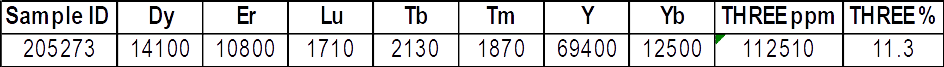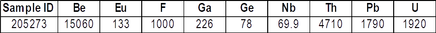 Tables 1 to 3 summarize the anomalous assays from this sample* which contained 20% Total Rare Earth Elements (“TREE”), with 8.7% being light rare earth elements (“TLREE”), and 11.3% being total heavy rare earth elements (“THREE”). The sample also contained 226 gpt gallium, 78 gpt germanium and 15,060 gpt beryllium.