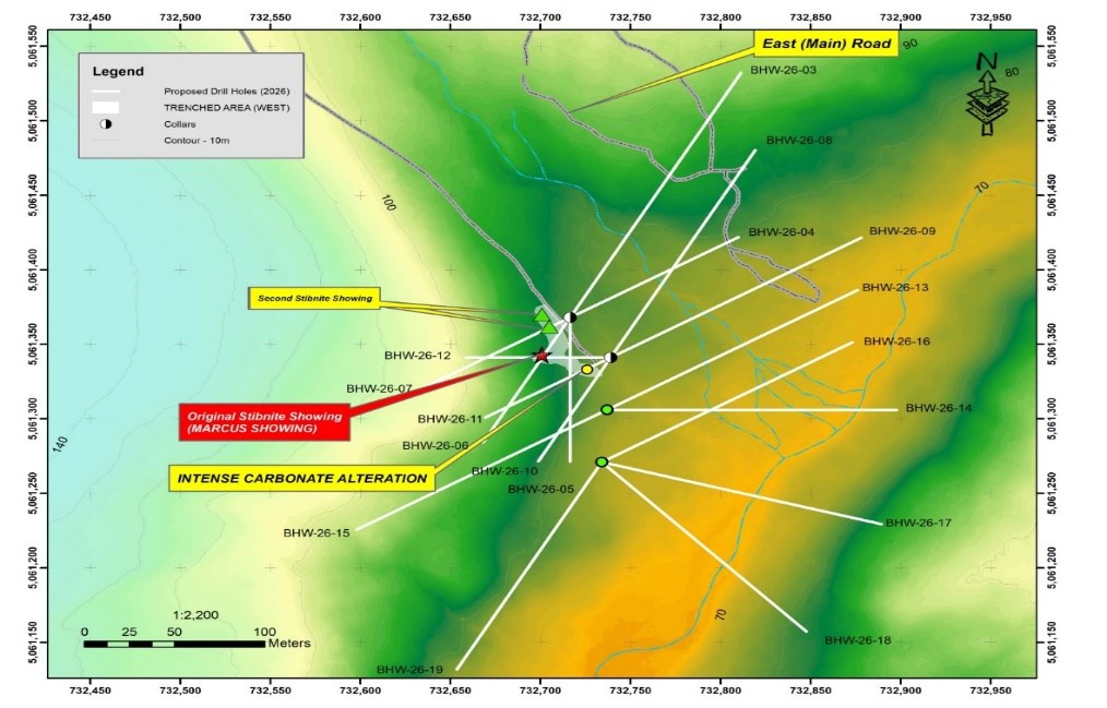 - Drilling on the Marcus (West) zone has begun and will be focused on intersected antimony-bearing stibnite at a depth of between 75 and 100 meters depth beneath the trenched area of the “Discovery Boulder” (see PR dated February 9, 2026)