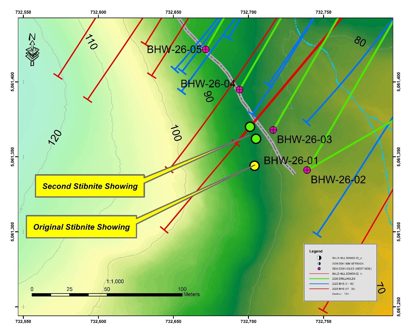 It can be seen from Figure 1 that the newly discovered mineralization can easily be tested by shallow drilling from locations such as BHW26-01 to 04 simply by turning the drill 180 degrees.