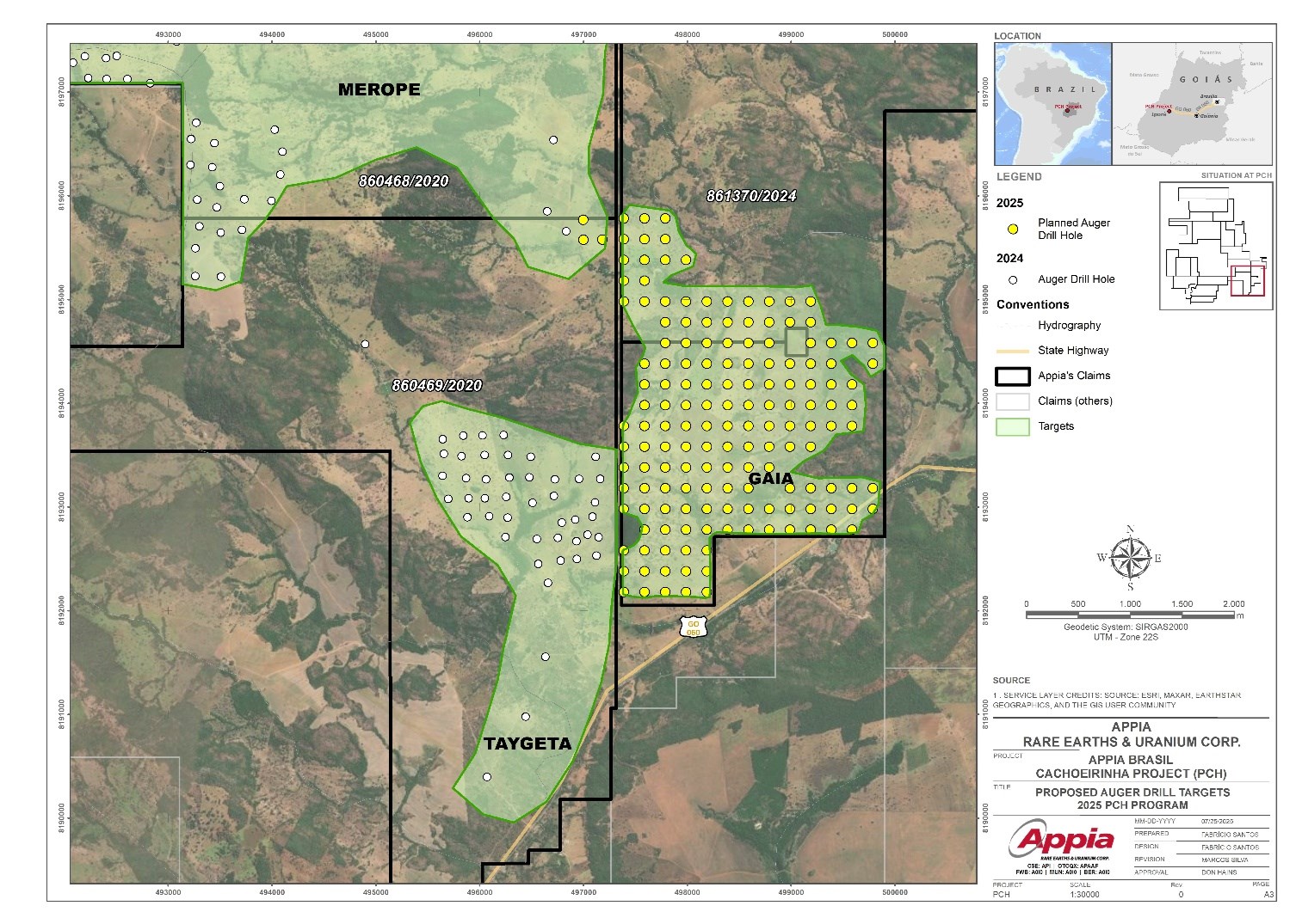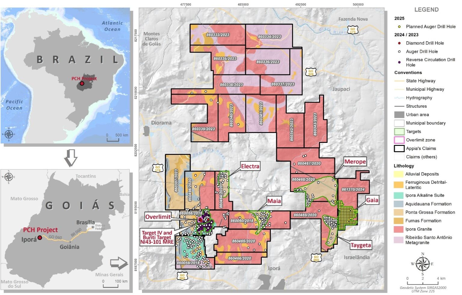 July 29, 2025 (Source) — Appia Rare Earths & Uranium Corp. (CSE: API) (OTCQB: APAAF) (FSE: A0I0) (MUN: A0I0) (BER: A0I0) (the “Company” or “Appia”) is pleased to announce it has acquired two auger drill rigs and initiated Phase 1 of a new 241-hole auger campaign, which will begin with the first 100 holes. These first holes will test the newly defined Gaia target, located adjacent to the Taygeta and Merope zones within the PCH rare-earth element (REE) project in Goiás State, Brazil (Figure 1). This area was selected for its strong geological and geophysical similarities to Taygeta and Merope, where previous drilling identified high-grade, shallow ionic-adsorption clay (IAC) mineralization. Drilling is scheduled to begin by August 1st, 2025.