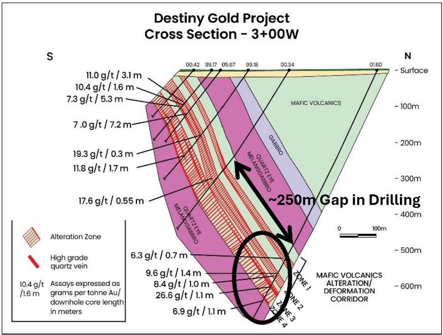 Figure 1: Cross-section illustrating vertical gap in deeper drilling at Destiny.