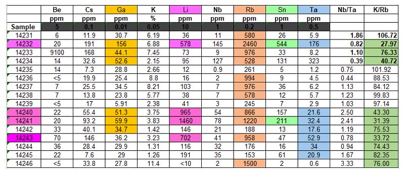 A review of an east-west-striking pegmatite in the outcrop on the southeast shore of Shatford Lake that was prospected, mapped and sampled contains anomalous gallium up to 400 metres in strike length. This pegmatite is open to the east and west of the sampled locations. The pegmatite is a minimum 30 metres wide from the shoreline to its exposed southern contact. The northern geological contact occurs somewhere underneath the lake. The pegmatite contains cassiterite, beryl and trace columbite mineralization, as well as spectacular mica series mineralization from black biotite to phlogopite, chrome mica to spectacular muscovite series. Columbite mineralization is a key mineral containing significant elemental niobium and tantalum.