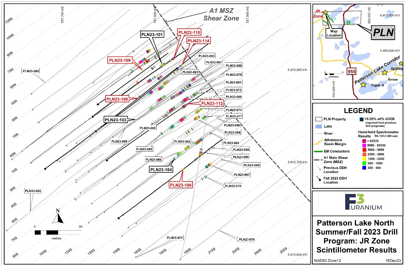 December 18, 2023 (Source) — F3 Uranium Corp (TSXV: FUU) (OTCQB: FUUFF) (“F3” or “the Company“) is pleased to announce initial scintillometer results from the last eleven drill holes of the fall drill program on the Patterson Lake North (“PLN”) Property, including multiple high grade intercepts. In particular drill hole PLN23-110 tested for mineralization up dip of PLN23-101 (see NR dated October 16, 2023) and intersected mineralization within a 11.5m interval including 1.50m of continuous off scale radioactivity (>65,535 cps). Drill hole PLN23-112 tested mineralization down dip of PLN23-068 (see NR dated August 14, 2023) and intersected mineralization within a 11.5m interval including 1.35m of composite off-scale radioactivity (65,535 cps).
