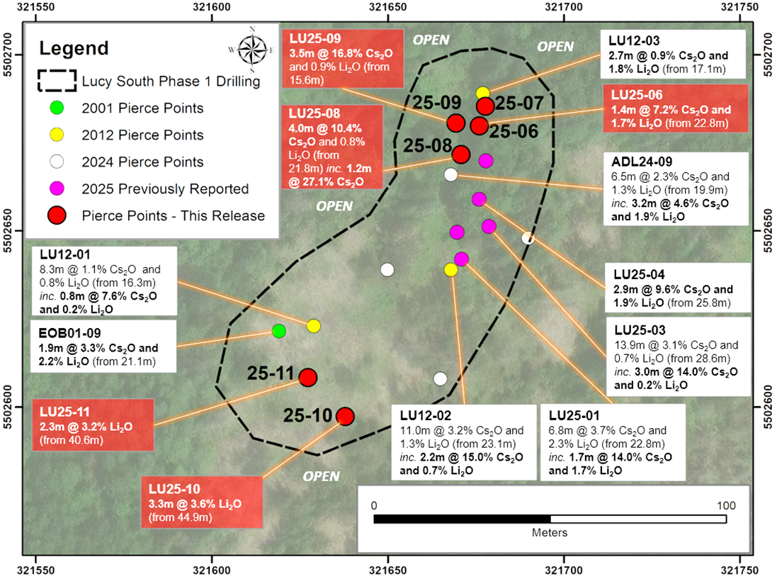 - High-grade cesium intercepts, including 4.0m at 10.4% Cs2O with 1.2m at 27.1% Cs2O (LU25-08) and 3.45m at 16.8% Cs2O (LU25-09), are amongst the highest Cs2O drill intercepts reported globally, in recent years.