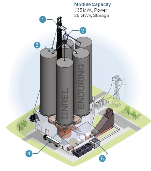 Figure A. Sand-Thermal Energy Storage System Consists of: (1) Particle-Lifting Device, (2) Charging Electric Heater, (3) Internally Insulated Storage Silos, (4) Discharge Heat Exchanger, and (5) Combined Cycle Power Generation.