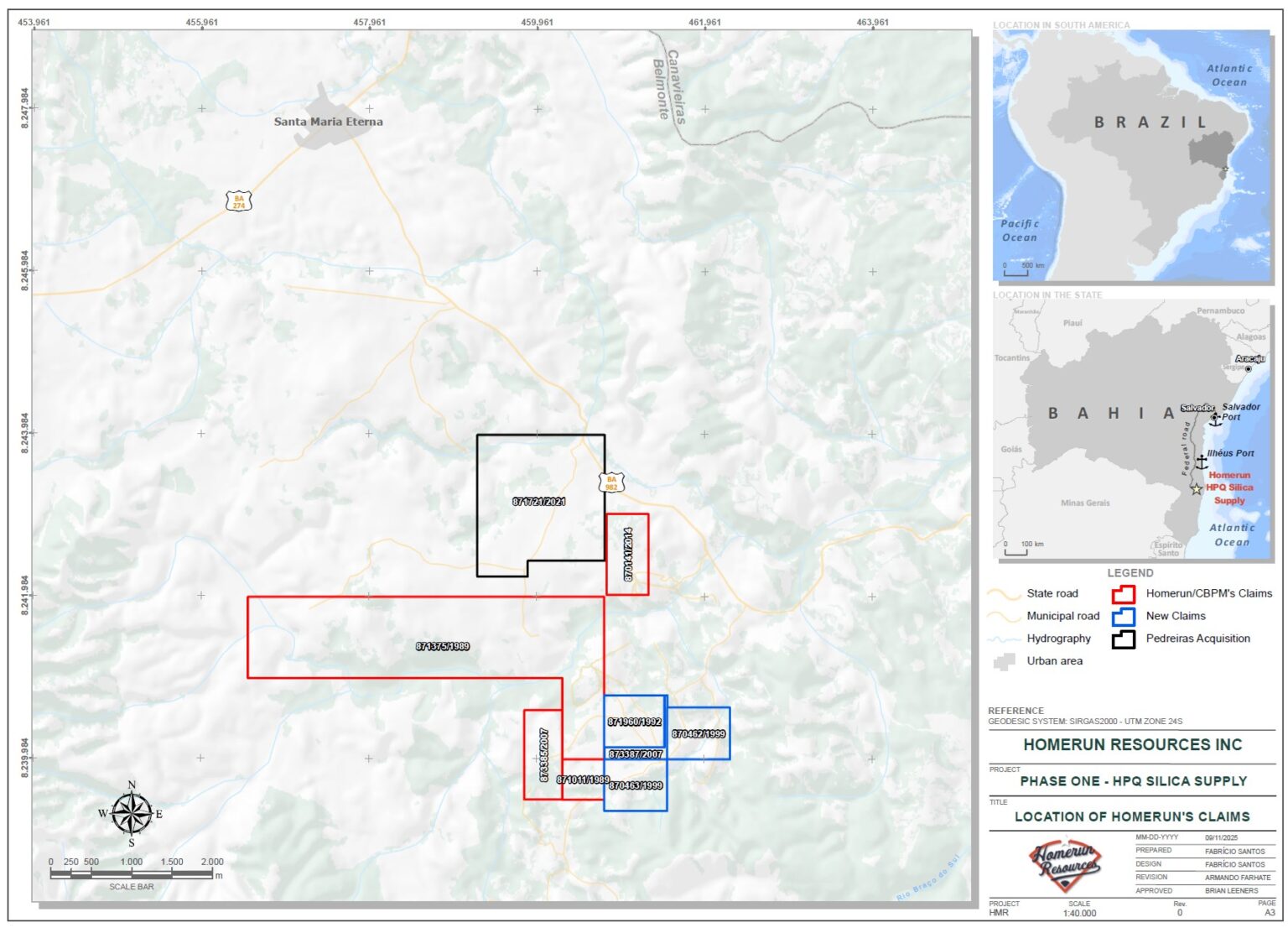 September 12, 2025 (Source) — Homerun Resources Inc. (TSXV: HMR) (OTCQB: HMRFF) (“Homerun” or the “Company”) is pleased to announce it has signed a binding Letter of Intent (LOI) with Pedreiras do Brasil S.A. (“Pedreiras”) a company controlled by Vitoria Stone, dated September 10, 2025, securing the rights to exploit the Pedreiras mining tenement (871.721/2021, 246.36 hectares) at the Santa Maria Eterna Silica Sand District in the municipality of Belmonte, Bahia, Brazil, granted under a lease agreement with Companhia Bahiana de Pesquisa Mineral (CBPM).