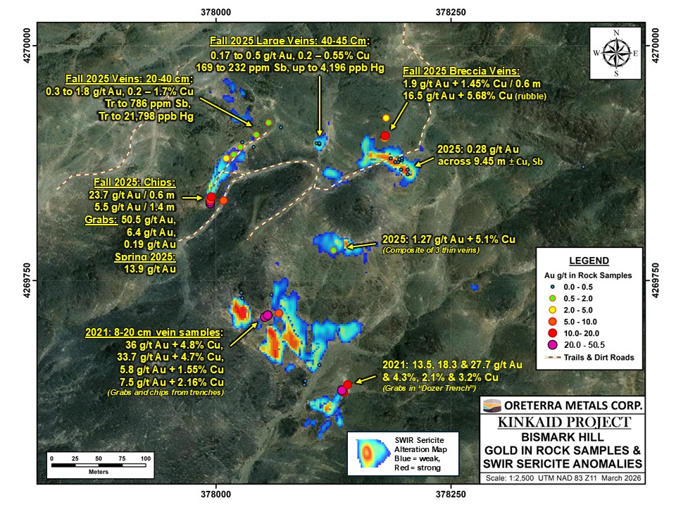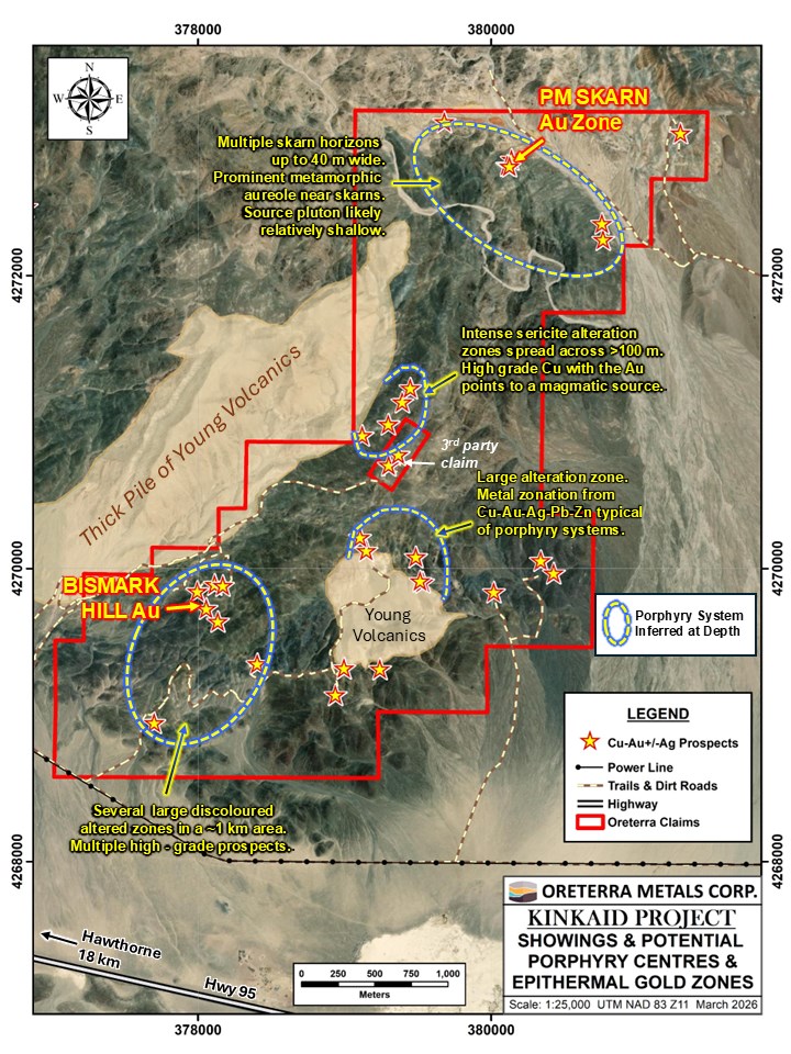 March 17, 2026 (Source) — Oreterra Metals Corp. (TSXV: OTMC) (OTCID: OTMCF) (FSE: D4R0) (WKN: A421RQ) (“Oreterra” or the “Company“) is pleased to report very encouraging assay results from late 2025 field work (Table 1, below) on the Company’s 100% owned, road-accessible Kinkaid project in the Walker Lane trend of southwestern Nevada. The work was in follow-up to the initial discovery of epithermal style gold mineralization in spring 2025 at the PM Skarn and Bismark Hill targets (see news, August 7, 2025). These zones, along with dozens of old mine workings and prospect pits dispersed across the Kinkaid property, appear to be part of much larger alteration and mineralization systems postulated to overlie as many as four buried porphyry Cu-Au intrusive centres (see Figure 1). The goal of the ongoing programs of mapping, rock and soil sampling, together with an upcoming aeromagnetic and radiometric survey, as well as an induced polarization (IP) survey anticipated for later in 2026, is to advance the PM Skarn and Bismark Hill gold targets and the various porphyry targets toward drill-ready status.