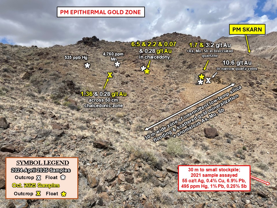 While it is sometimes difficult to discern the chalcedonic quartz overprint on the local quartzite and as a result not all samples taken so far are auriferous, the gold assays returned from the PM zone are still considered highly encouraging and believed to be indicative of a structurally controlled epithermal gold mineralizing event. The locally elevated levels of manganese (to 4,760 ppm Mn), mercury (to 617 ppb Hg) and antimony (to 673 ppm Sb) add further support to this model, as does the presence 30 metres away of a small stockpile of silver-rich, epithermal-style vein material that has assayed in previous sampling 495 ppm mercury and 0.25% antimony, elements typically found in epithermal systems, as well as 1,725 g/t (61 oz/t) silver, 6.9% zinc, 0.4% copper, and 1% lead (see news, March 10, 2022).