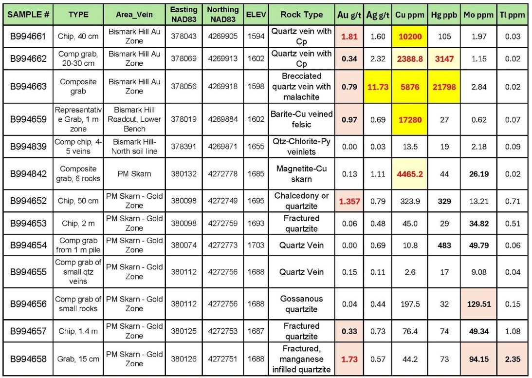 A Short-Wave Infrared (SWIR) alteration mineral study undertaken in 2023 identified a series of strong sericite (white mica) anomalies coincident with known mineralization on the property as well as multiple anomalies clustered in a 350 x 240 metre alteration zone centred on Bismark Hill (see Figure 2). Sericite is a key indicator mineral for hydrothermal alteration commonly associated with copper and gold bearing systems. The fall 2025 work, coupled with earlier sampling by the Company, has now confirmed the presence of gold ± copper mineralization at every sericite anomaly around Bismark Hill (Fig. 2). Noteworthy results include: