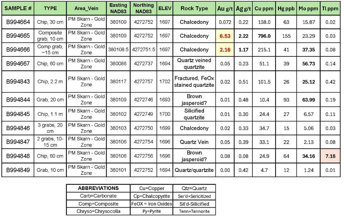 Figure 3: Analytical results of mineralized rock samples overlain on a photo of the PM Skarn gold zone