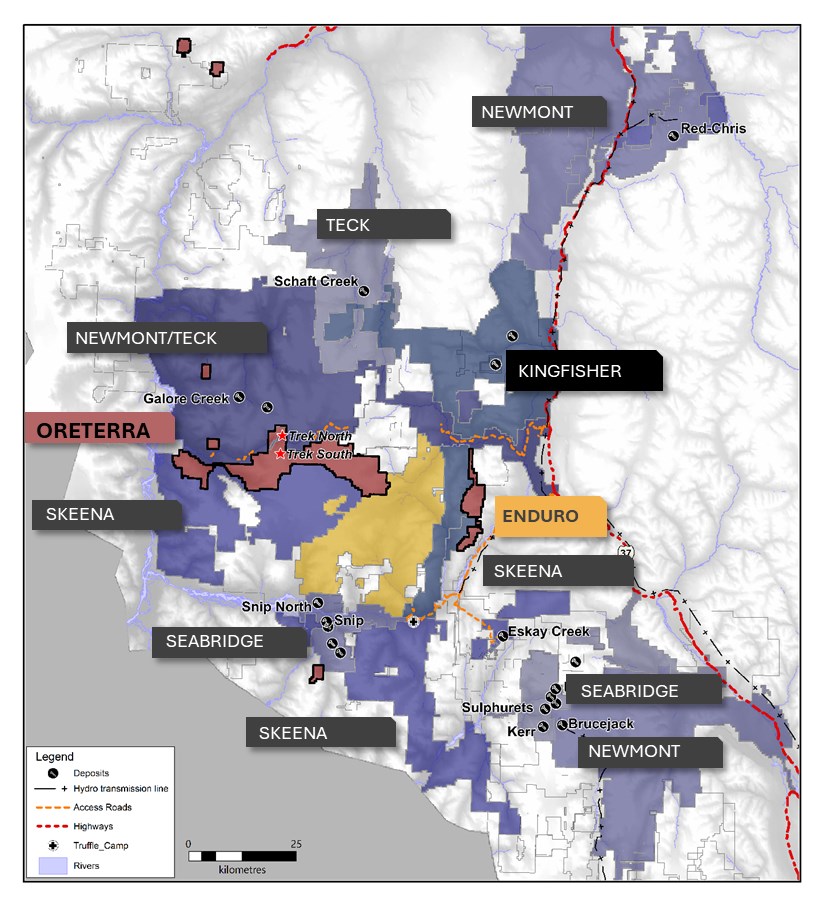 Map 1 – Location map of Oreterra Metals and Enduro Metals’ exploration claims in the Golden Triangle, British Columbia.