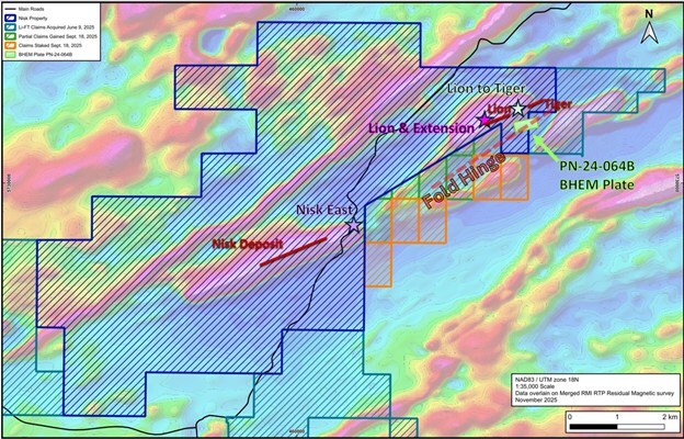 Drilling at the Nisk East target includes holes PMN-25-005 thru PMN-25-011. Modest intersections of Ni-Cu-Pd mineralization was intersected in holes PMN-25-005, 008 and 011, including 4.00m of 2.34% CuEqRec1 in hole PMN-25-005. The Nisk East area is now being re-assessed with the recent land acquisition to the west (see news release November 4, 2025) which now allows Power Metallic to effectively target the extension of the geology that hosts this Ni-Cu system (Figure 2) and is on strike with the Lion and recently intersected Lion West zone (assays pending).