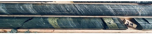 Recent drilling targeted the shallowest of these trends to determine if this mineralization trend had validity and would extend beyond the known boundaries of the Lion Zone. The first hole in this program, PML-26-054 has intersected 5m of Lion style mineralization with visible copper in narrow massive lenses (Figure 2) and disseminated and stringer style chalcopyrite.
