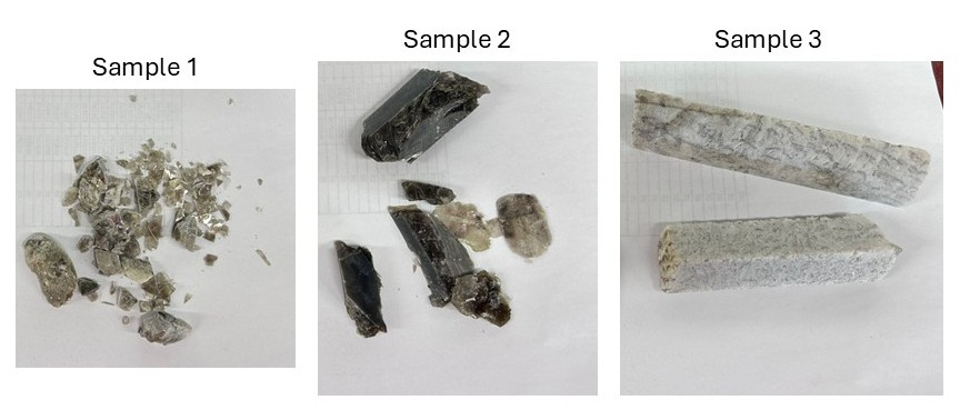 As a precursor to the detailed mineralogical studies that are currently underway at SGS Lakefield, the Quantum geologists hand selected three samples to test if Ga, Rb, Cs were associated with the mineral mica. Samples 1 and 2 were thought to be comprised mostly of the mineral mica whereas sample 3 was thought to contain other minerals such as feldspars and quartz. The three samples are shown in Figure 1.