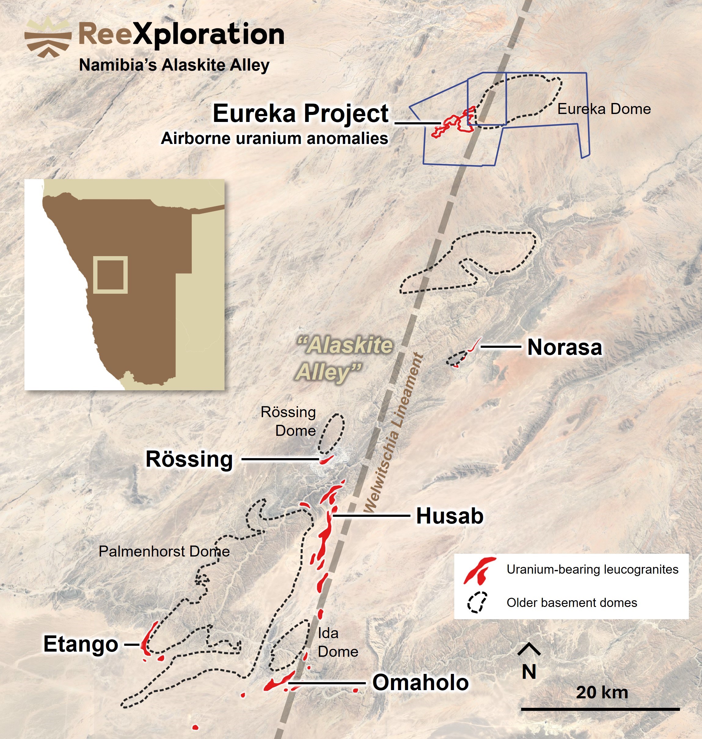 February 9, 2026 (Source) — ReeXploration Inc. (TSXV: REE) (FSE: K2I0) (“ReeXploration” or the “Company”) is pleased to announce the launch of a fully funded uranium drilling program at the Eureka Project in central Namibia. This campaign marks the Company’s first drill testing of a large-scale uranium target, 6.5 x 3.5 km in extent, defined through integrated geophysical, geochemical, and geological work. The target is located along trend of Namibia’s world renowned “Alaskite Alley”, a corridor hosting giant leucogranite-hosted uranium deposits.