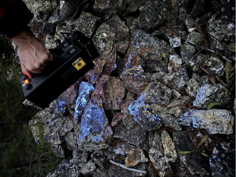 The field program involved mapping the surface of the stockpiles and the collection of representative samples for analysis. The exposed coarse component of the stockpiles (Figure 2* Left) was mapped as predominantly granodiorite. Using a handheld fluorescent lamp,scheelite was identified in association with the granodiorite, occurring as veins and disseminations (Figure 2* Right). The stockpile material is characteristic of the mineralised granodiorite at the historical Golden Gate Tungsten Mine.