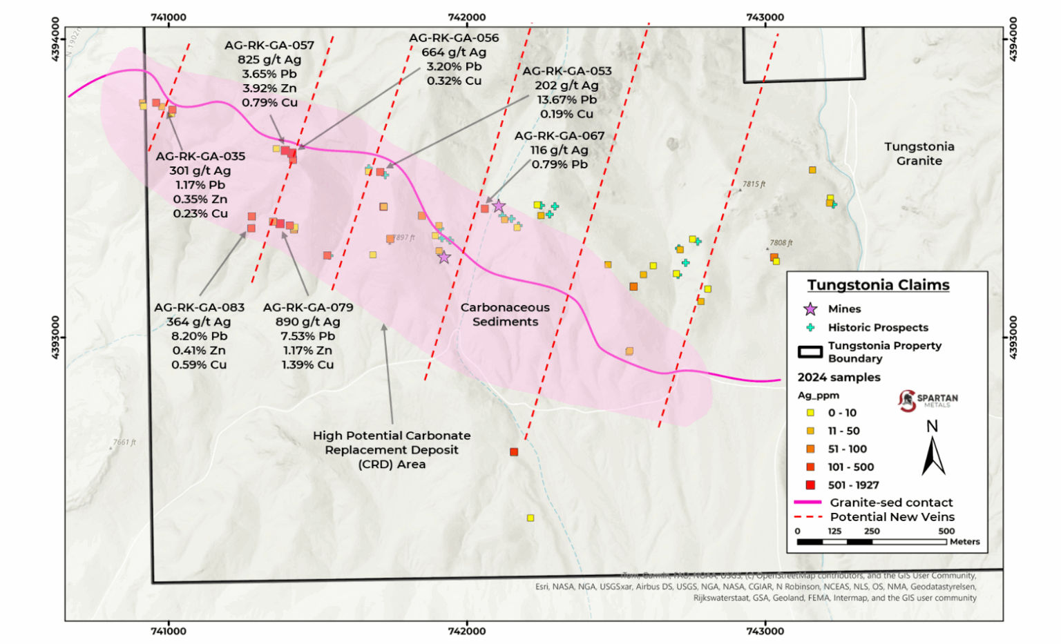 Brett Marsh, Spartan’s President and CEO, states “When hydrothermal fluids moving along the structural corridors interact with thick, carbonate-rich sedimentary packages at the contact with the Tungstonia Granite intrusion, we have the potential to develop an enriched depositional zone along preferred limestone and dolostone beds, at structural intersections, and where we see veining in our host rocks. The rock chip samples from 2024 returned several high-grade results that carry several of the primary metals commonly associated with carbonate replacement deposit mineralization including silver, lead, copper, and zinc. This strongly suggests the potential for a larger carbonate replacement deposit that could potentially contain significant critical metal concentrations at the Tungstonia Claim Block.”