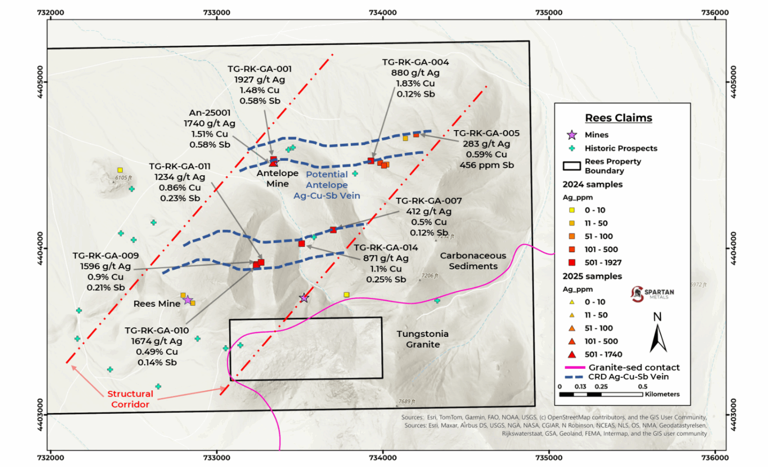 Figure 2 View of southeast portion of Rees Claim block with rock chip samples showing high-grade Ag, Cu, and Sb. Samples shown (except An-25001) were previously reported in July 31, 2025, NI 43-101 Technical Report on the Eagle Project.