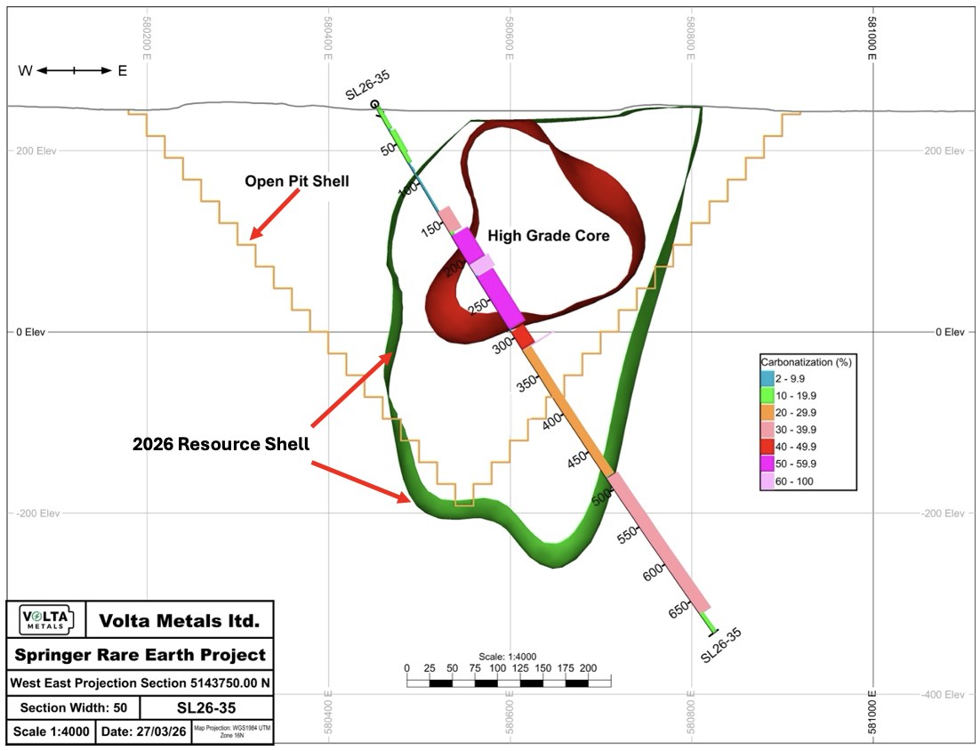 March 31, 2026 (Source) — Volta Metals Ltd. (CSE: VLTA) (FSE: D0W) (OTCID: VOLMF) (“Volta” or the “Company“) is pleased to report that drill hole SL26-35 from its 2026 winter drill program has intersected continuous carbonatite mineralization over 688 metres (“m“) at its Springer Rare Earth Element (“REE“) Deposit, located near Sturgeon Falls, Ontario. This intercept from 5m to 693m ranks among the widest continuous carbonatite drill intersections reported globally and marks the deepest drill hole completed at Springer to date (Figure 1). The entire core from SL26-35 will be submitted to the Saskatchewan Research Council (“SRC“) in Saskatoon, a specialist facility for REE and critical mineral analysis, with assay results expected in the second quarter of 2026.