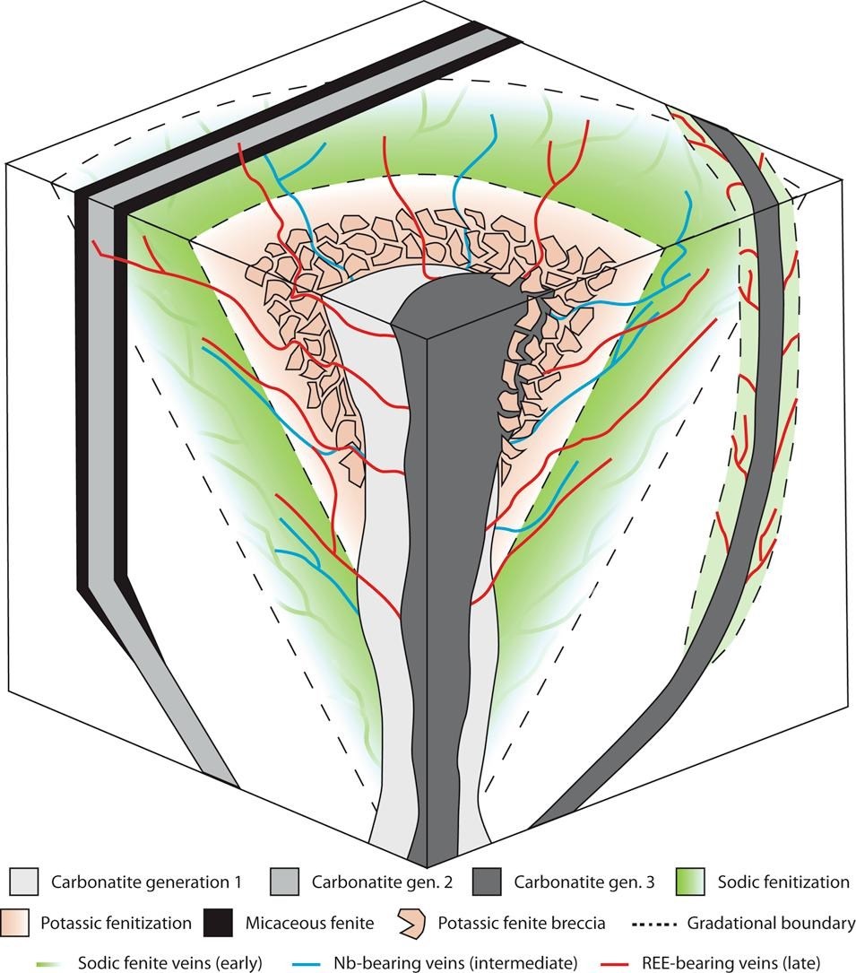 Figure 4. Idealized block diagram summarizing fenitization relationships and carbonatite pipe architecture at a generalized carbonatite complex (Elliot et al., 2018).