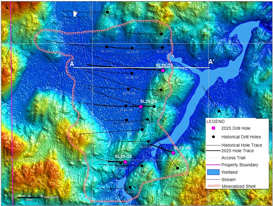 Borehole SL25-23 was designed to confirm the presence of high-grade rare earth elements and potential gallium mineralization intersected in historical borehole SL11-03 (Figure 3). The first 200m of the borehole confirmed the presence of high-grade mineralization (gallium assays are pending).