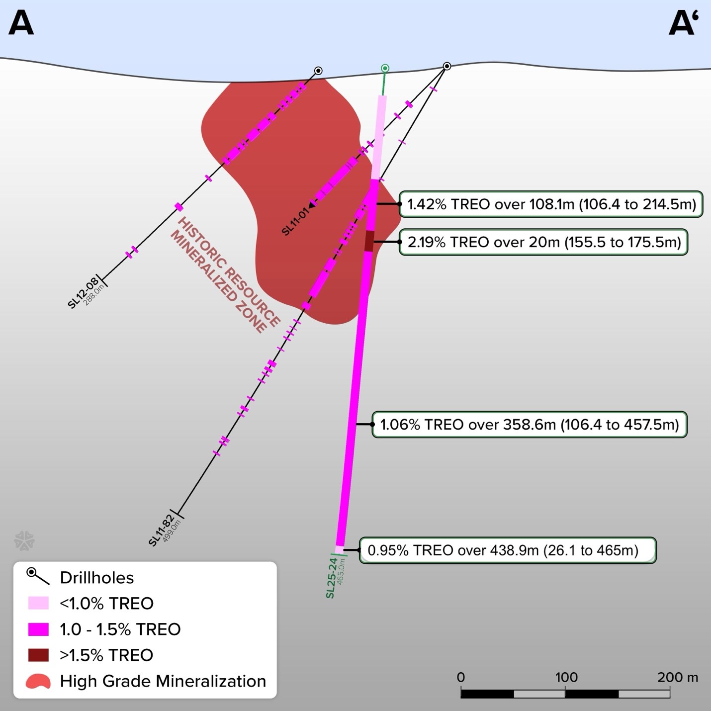 Borehole SL25-24 was drilled sub-vertical (at -85 degrees), to test the mineralization at depth below the historic resource estimate (Figure 2 and Figure 3). The drillhole returned significant mineralization, 0.95% TREO, over the entire sampled interval, to end-of-hole at 465m (Table 1).