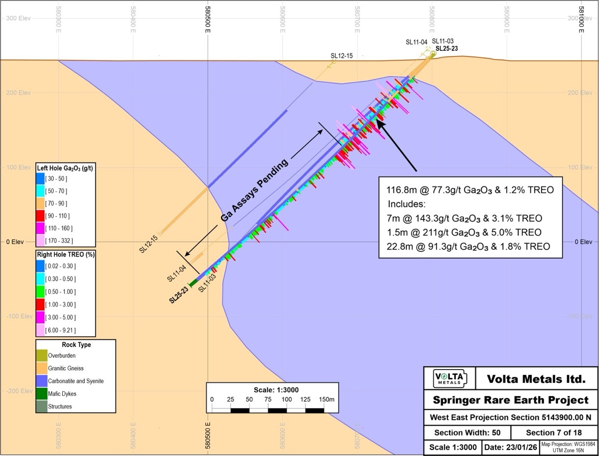 January 26, 2026 (Source) — Volta Metals Ltd. (CSE: VLTA) (FSE: D0W) (OTC Pink: VOLMF) (“Volta” or the “Company“) is pleased to report initial gallium assay results from its Springer Rare Earth Project in Sturgeon Falls, Ontario, Canada. The newly received assays from drill hole SL25-23 confirm thick, continuous gallium mineralization over a 116.8m interval grading 77 g/t Ga2O3, including multiple high-grade zones exceeding 100 g/t Ga2O3 (Figure 1).